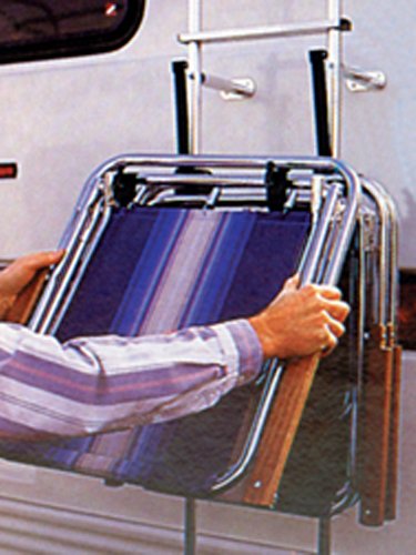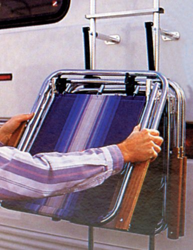 Camco RV Clamp-N-Carry Chair and Bike Rack is designed to securely hold four or more chairs depending on chair style on most standard 1 inch and 7/8 inch diameter ladders that include adapters. It has glass-filled nylon construction with UV protectants and zinc-plated hardware. This rack is lockable and won't rust or corrode, as well as swings out of the way quickly for ladder access.